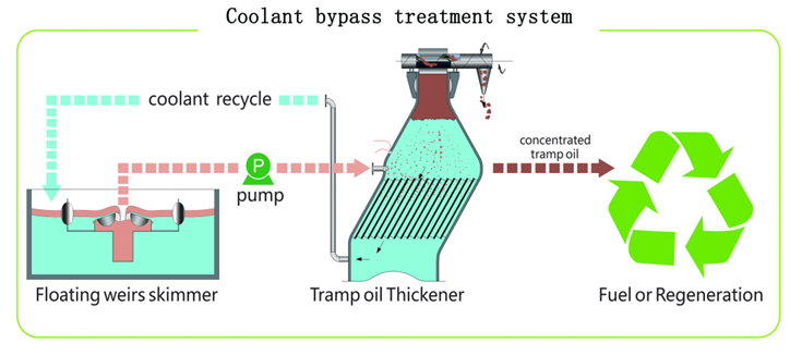 This system is continuously online skimming, separation, concentration, etc. The tramp oil that coalesces largest amount insoluble contaminants  is discharged from the emulsion system in the form of concentrated tramp oil . This type of bypass treatment achieves the goal of no downtime maintenance. The amount of bypass treatment is very few compared to the emulsion working cycle. It does not affect the matching of the original system pump, and minimizing heat loss.